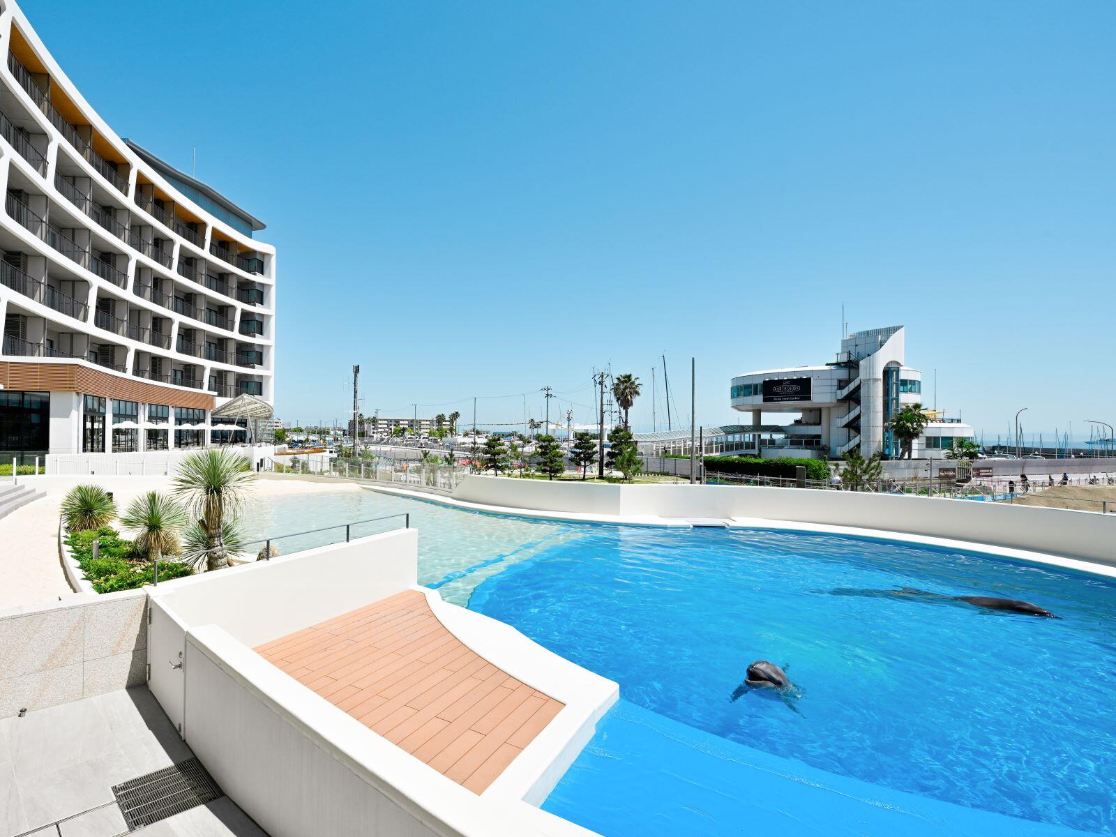 2024年6月にオープンした神戸須磨シーワールドのオフィシャルホテル。ホテルエントランスを入ると、瀬戸内の象徴「渦潮」と「波」をモチーフとしたロビーが広がり、全室オーシャンビューのお部屋からは、時間とともに移りゆく瀬戸内海を一望いただけます。日本初となる「ドルフィンラグーン」では、目の前でイルカが見られるという、ここでしか味わえない体験をお楽しみいただきながら、生命とつながる豊かな時間をお過ごしください。お食事は地産地消を取り入れた、地元ならではのお料理をご提供。ご宿泊の方は、無料で神戸須磨シーワールドへご入館いただけます。