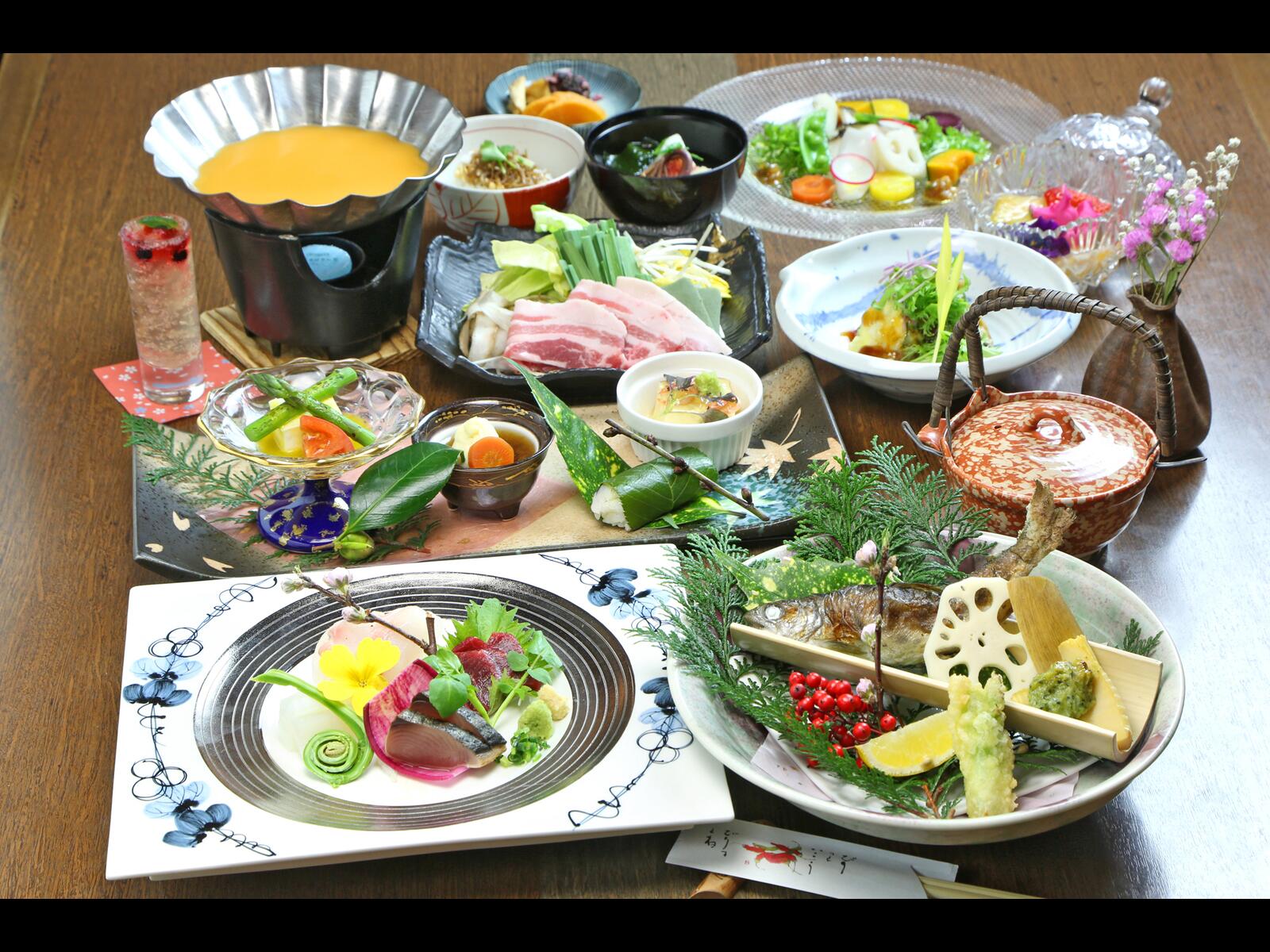 田舎の風情残る静かな環境の中、母屋を中心に露天風呂・客室・個室の食事処が点在し、ゆったりとした寛ぎの時間をお楽しみいただけます。