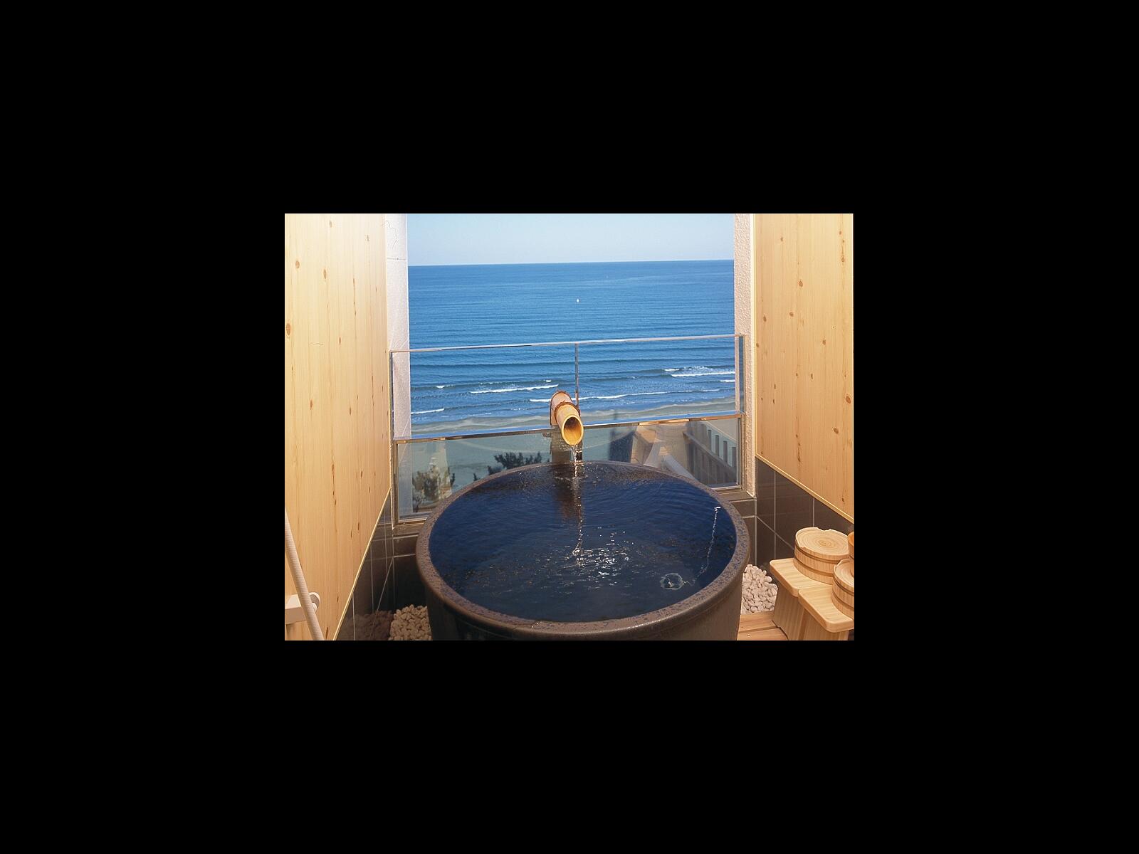 夏はホテル前ビーチへ水着のまま行け、ご家族のレジャーに最適。屋上には展望露天風呂と貸切が出来る家族露天風呂もあり、露天風呂付客室もあります。