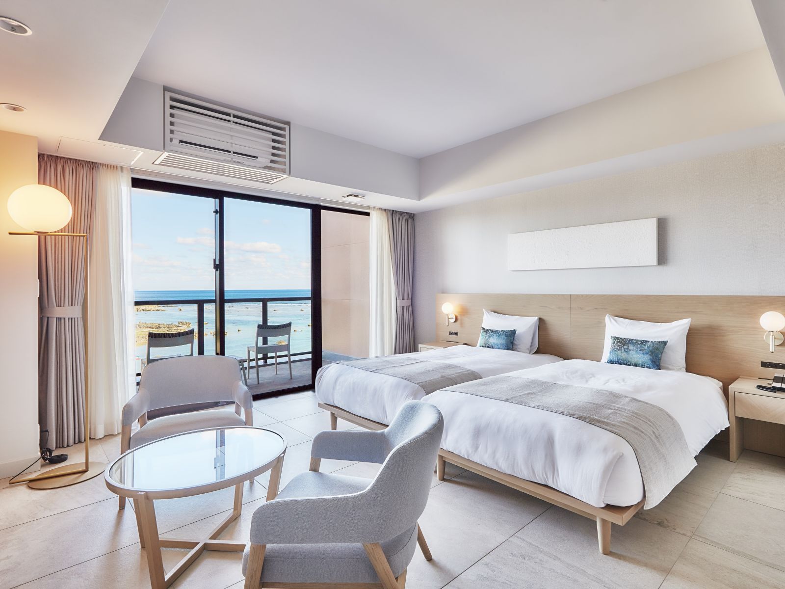 南国の緑豊かなガーデンテラスの奥にはオーシャンビューの壮大な景観が広がります。 テラスには温水対応の専用プールが設けられ季節を問わず南国の島時間を謳歌するリゾートステイをお楽しみいただけます。
