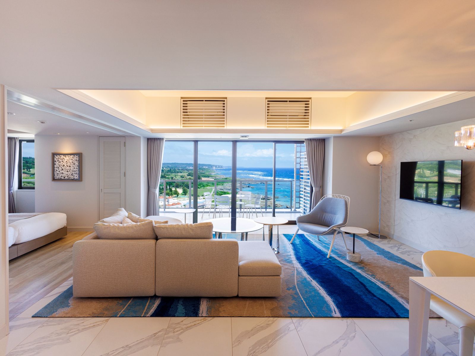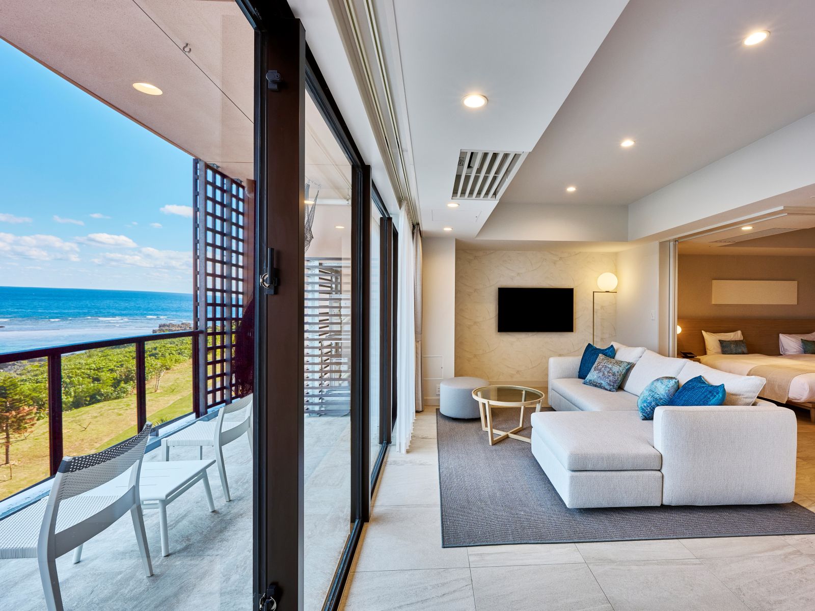 邸宅で暮らす滞在をコンセプトに、住まいとしてのファシリティを備えた贅沢でゆとりあるゲストルーム。 テラスからの陽光と心地よく爽やかな潮風が通り抜けるまるで「特等席」のようなリビングは刻一刻と表情を変えていく自然の色彩を存分にお楽しみいただくことができます。