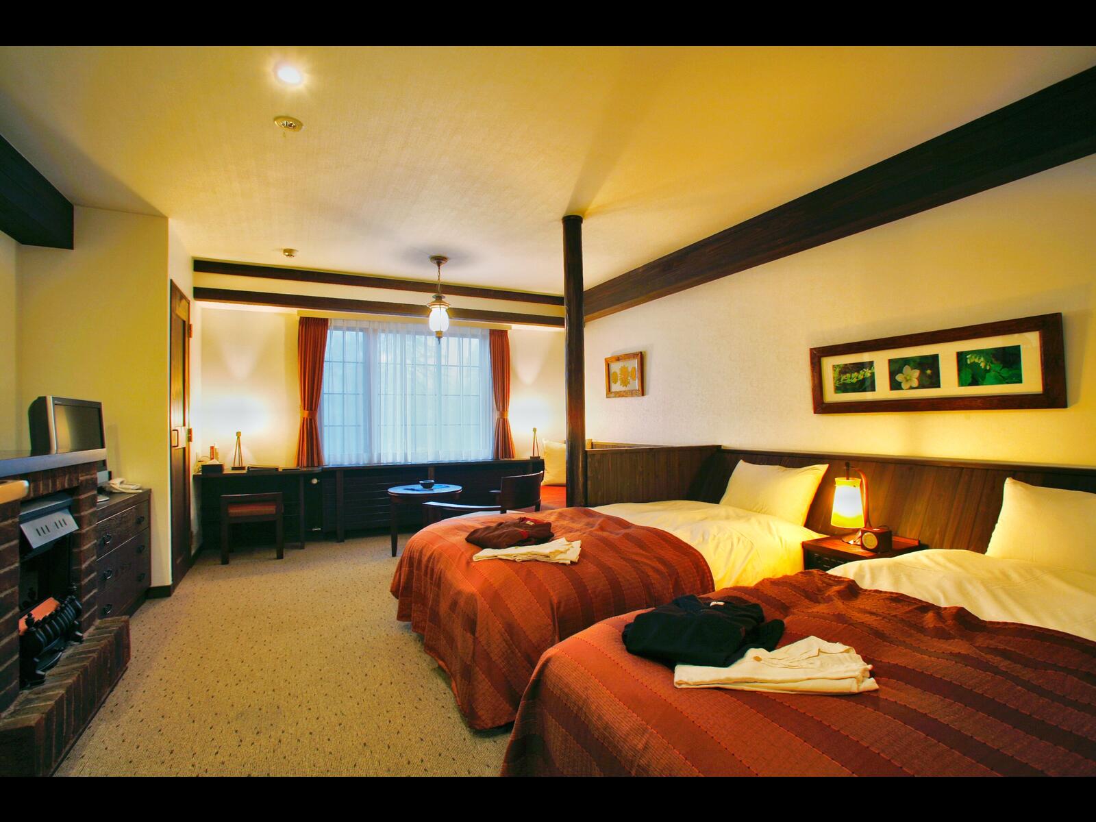 落ち着いた色調の約32㎡もある広々としたツインベッドルームには、ぬくもりを感じさせる暖炉の光が心を和ませてくれます。