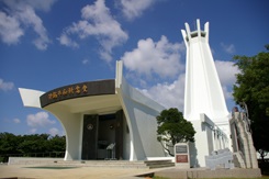 堂内には高さ12mの平和祈念像が安置、壁面には「戦争と平和」をテーマにした絵画を展示。平和を祈る絵画が展示された美術館と国内最大蝶・黄金の蛹オオゴマダラ蝶の美ら蝶園もあります。 -