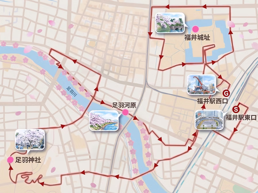 福井駅東口ーー泉橋(車窓)ーー足羽神社(下車)ーー足羽山(車窓)ーー幸橋(車窓)ーー福井城址(下車)ーー福井駅西口