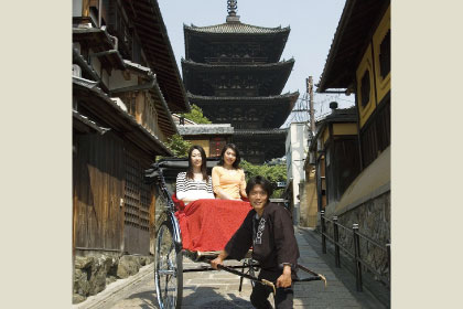 京のまちを人力車に乗って観光していただけます。俥夫がご案内するひとときをお楽しみください。