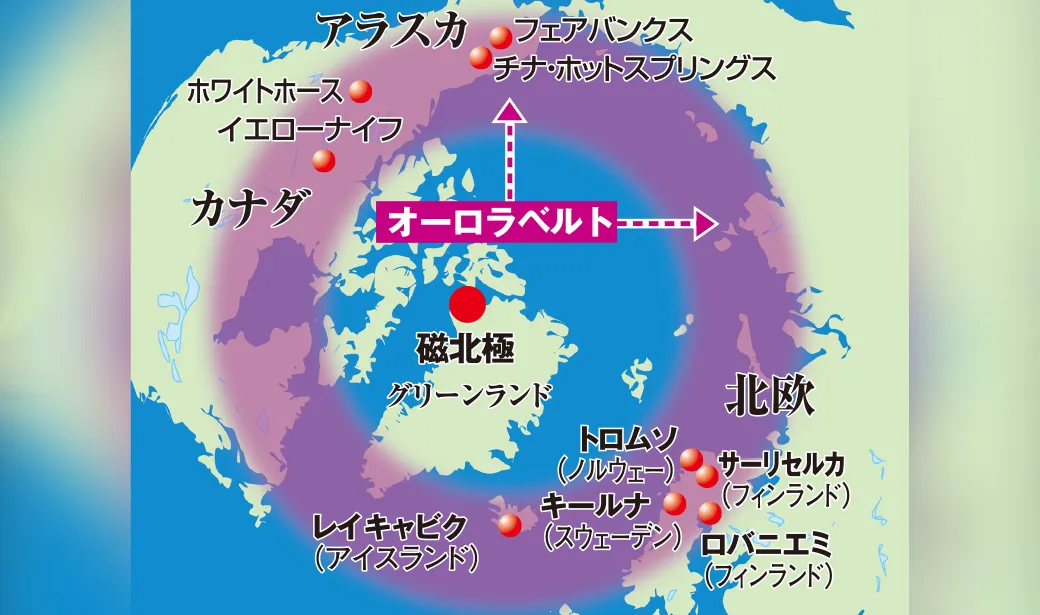 オーロラは、地球上でオーロラベルトと呼ばれる北緯65~70度前後のエリアでよく出現します。カナダ、アラスカ、フィンランド、北欧は、このオーロラベルト直下に位置し、非常に高いオーロラ出現率を誇る世界でも有数のオーロラ観賞地です。