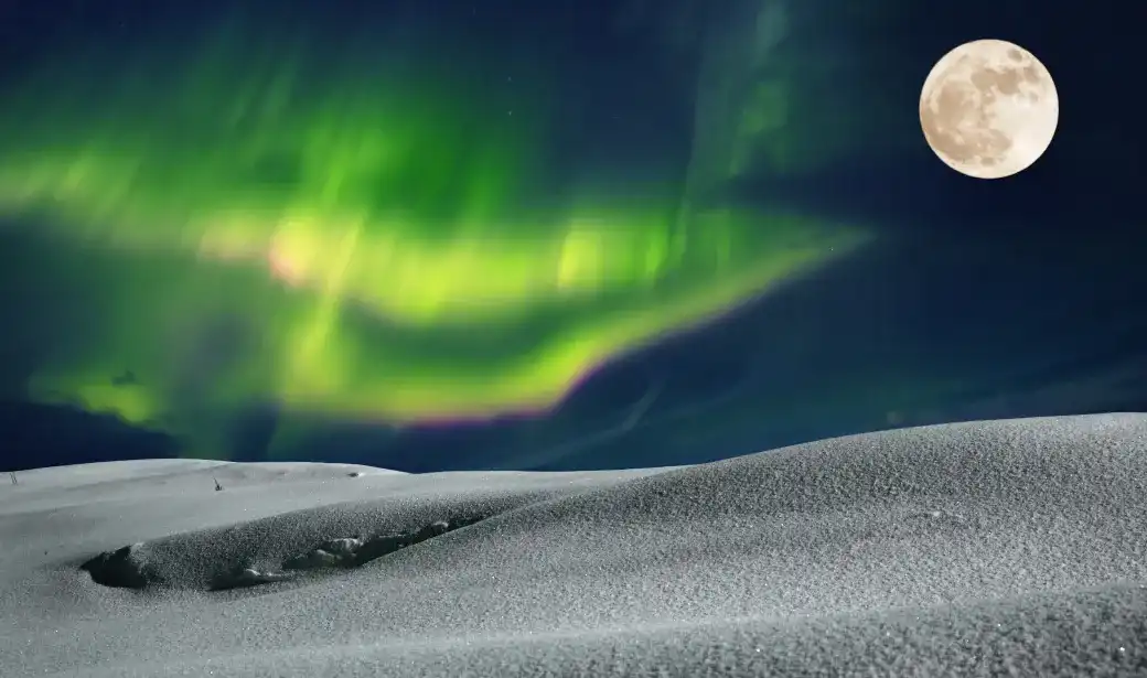 オーロラは雲よりもっと上の宇宙での現象。雲が出てくるとオーロラが隠れてしまい肉眼では見られないので「晴天日であること」と、周囲の明るさに邪魔されないこと=「暗いこと」が重要なポイントとなります。弱い明るさのオーロラは一般的に月の光の少ない新月の頃が見えやすくなります。満月でも曇りの日よりはオーロラがキレイに見える確率がぐっと上がります。満月のときに明るいオーロラが出た場合は、満月とオーロラの美しい写真を撮るシャッターチャンスです!