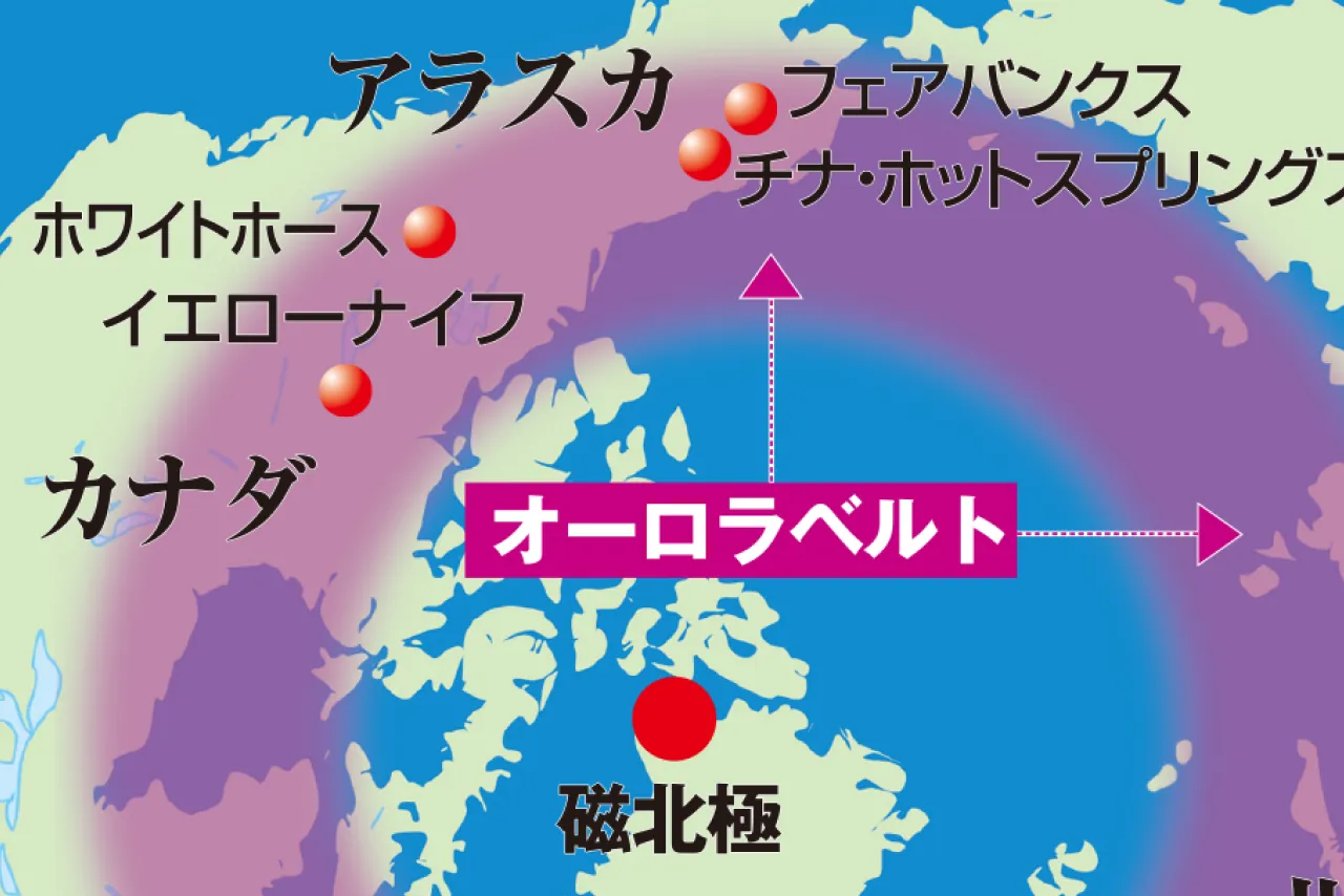 オーロラは、オーロラベルトと呼ばれる北緯65~70度前後のエリアでよく出現します。イエローナイフとホワイトホースは、このオーロラベルト直下に位置し、非常に高いオーロラ出現率を誇る世界でも有数のオーロラ観賞地です。