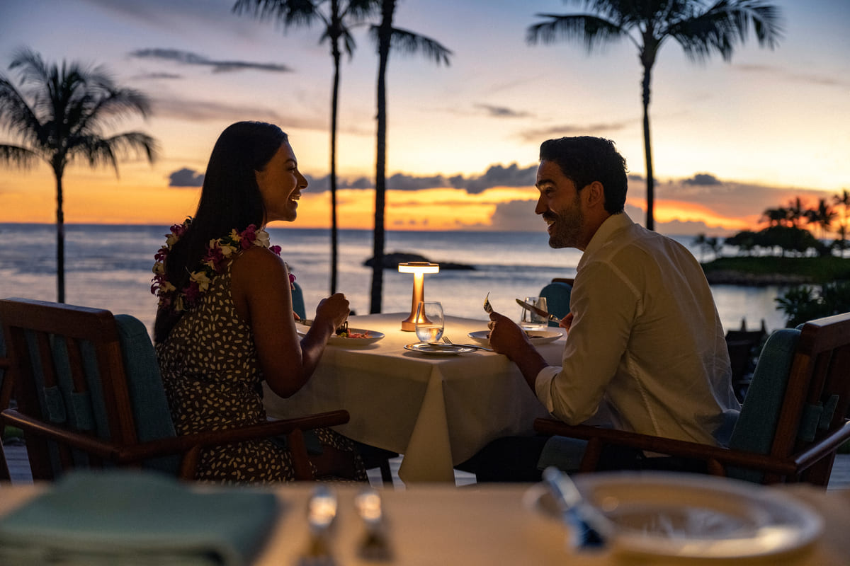 コオリナ・ビーチや夕日を眺めながらのディナーは格別。優雅な雰囲気の中、地元の魚や農産物などハワイの食材を活かしたワンランク上のお食事をお楽しみいただけるエレガントなレストランです。