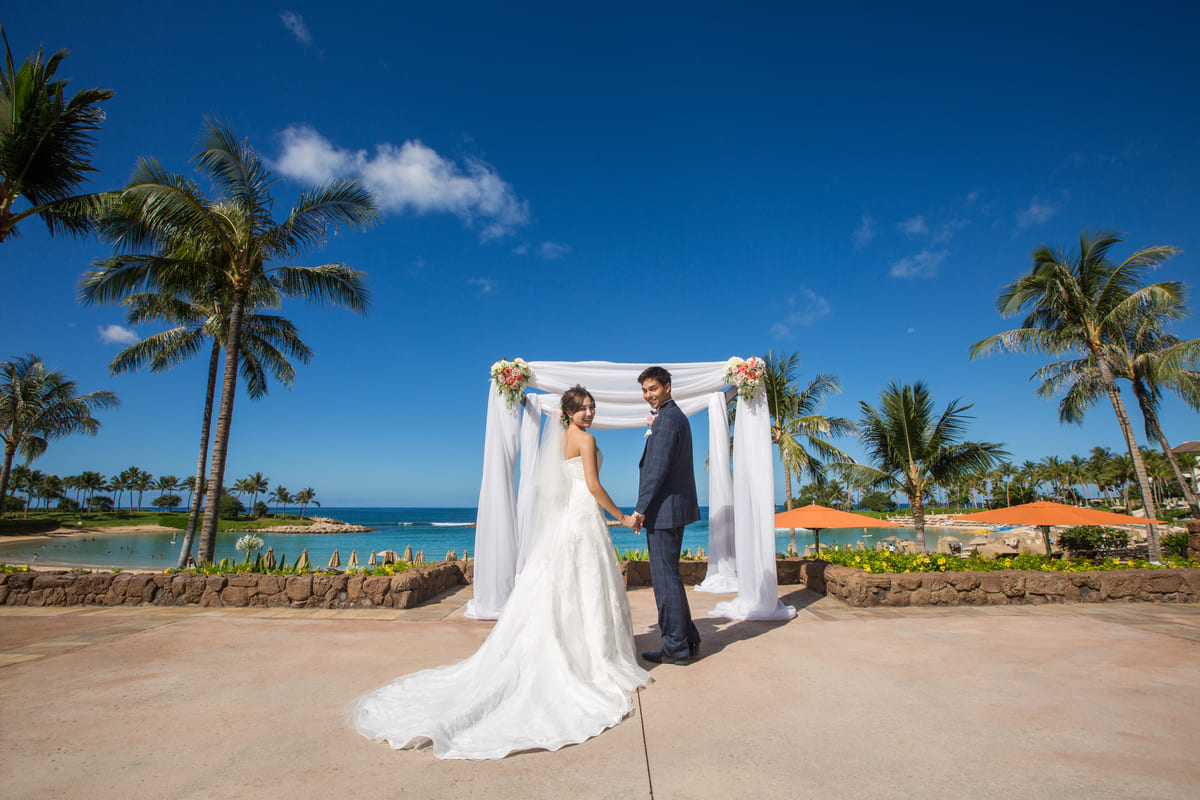 アウラニ・ディズニー・リゾート&スパ コオリナ・ハワイ内での挙式。「ファンタジー・ウエディング」ならアマアマ・パティオで挙げるオーシャンフロントウエディングを、「ドリーム・ウエディング」と「メモリーズ・ウエディング」なら緑に囲まれたハラヴァイ・ローンで挙げるガーデンウエディングができます。ディズニーキャラクターからの祝福で特別な時間をお楽しみください。
