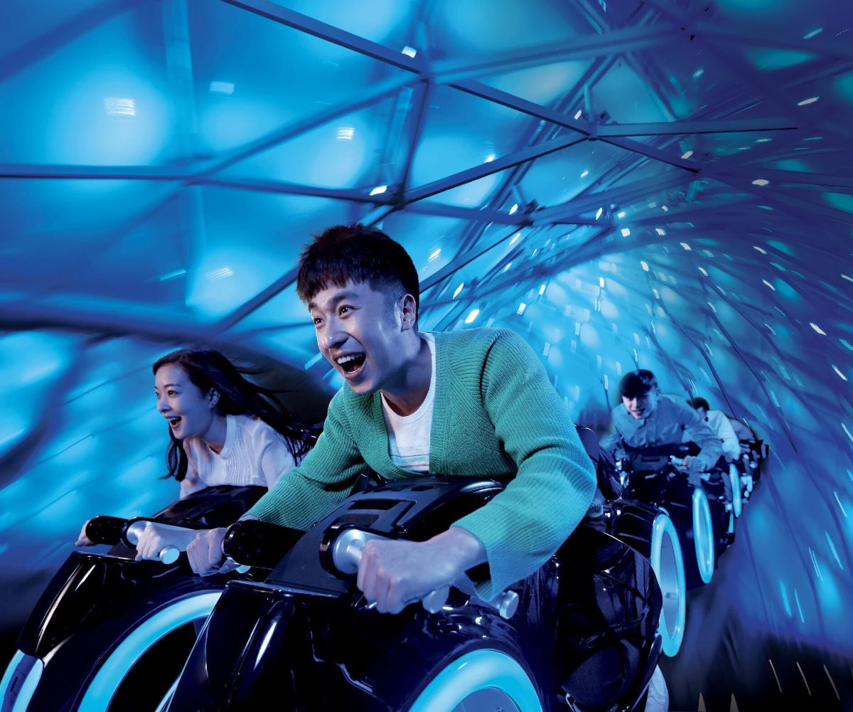 心躍る音楽、光、3D映像とともに暗闇のデジタル世界の中で、加速したり、落ちたりする快感を味わうことができるコースター。多感覚を刺激する「TRON」の世界を横断します。
