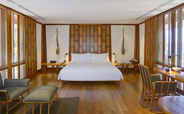 丘の斜面に広がる客室は、タイの伝統的建築スタイルにこだわりました。 大きなバスルームと広々としたドレッシングエリアを備え、優雅でモダンな空間を演出しています。お部屋の外にある東屋は開放感も抜群。室内にはテレビがなく、遠くに聞こえる汐の音や、鳥のさえずりなどの自然の音色に耳を澄ませて、ゆっくりとした時間をお過ごしいただけます。
