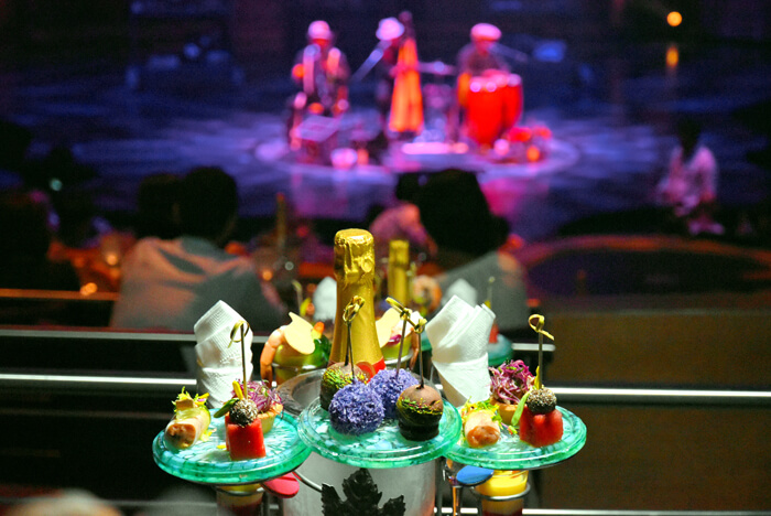 - シルク・ドゥ・ソレイユでも初となるコースディナーショーです。食事をショーに組み込むという斬新な試みで、JOYAの美しい芸術を5感と共に満喫していただけます。