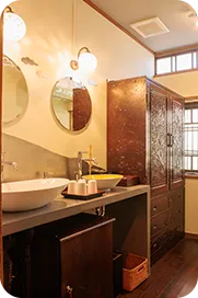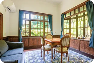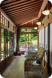 行学院覚林坊では、ご宿泊されるお客様に応じて、様々なお部屋をご用意しております。一棟貸し別院『迎賓館えびす屋』と異なり、お風呂、洗面所、トイレは共用となりますが、築90年の邸宅を改修した国の文化財である建屋では、まるで和の美術館に宿泊するような極上の時間を堪能いただけます。