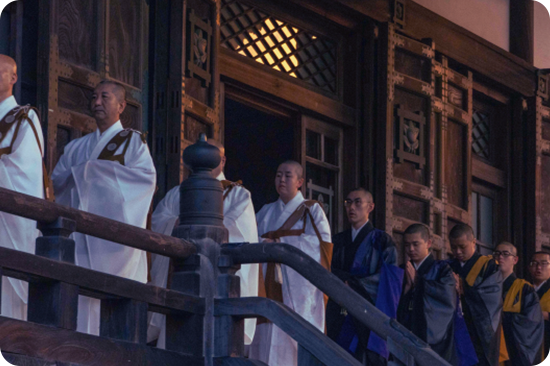 「朝勤」は僧侶が行列を成して大本堂へ向かう様から始まり、