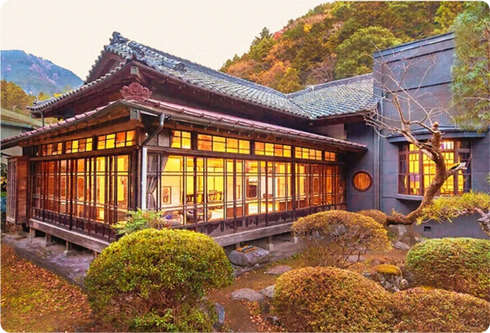 賓館えびす屋は、この地で財を築いたかつての名家「望月家」が擁した築90年の邸宅を、いまに甦らせた一棟貸しの宿です。国の文化財である建屋は、職人の意匠が光る純和室やかつて日本が西洋に憧れた大正文化を感じる洋室に、山の緑と川に面した開放的 なテラスも完備。お風呂は贅沢にも身延山唯一の温泉で、内・外風呂も楽しめます。室内を彩るアート作品の数々も相まって、まるで和の美術館に宿泊するよ うな極上の時間を堪能いただけます。