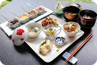 旅の中でも大きな楽しみである”食”。当寺院では、仏教の聖地で綿々と培われてきた精進料理を、食べやすいよう、さらにアレンジ。地域の特産であるあけぼの大豆を使った「あけぼの大豆の納豆(GI認証)」や地域の名産である「湯葉」をふんだんに使ったお料理で、身延の滞在に色を添えます。朝食2回、昼食3回、夕食2回とお客様のご希望に合わせてオーダーメイドいたします。以下はご提供するお食事の一例となります。