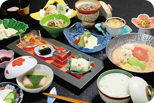 身延山の生湯葉と季節の旬菜にはじまり、当寺院でしか味わえない「湯葉の桜蒸し」や「湯葉と豆乳のトマト鍋」などもお召し上がりいただけます。また、自家製醤油麴のほか、新鮮な旬の食材を厳選して、料理からも季節を感じ取っていただけます。