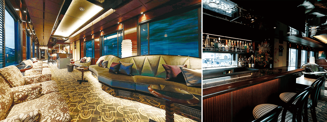バーカウンターや立礼(椅子に腰かけて行う茶道の点前形式)の茶の卓、ブティックスペースを備えたラウンジカーでは、木を多用した落ち着いた空間で、「瑞風」のおもてなしをお楽しみいただけます。