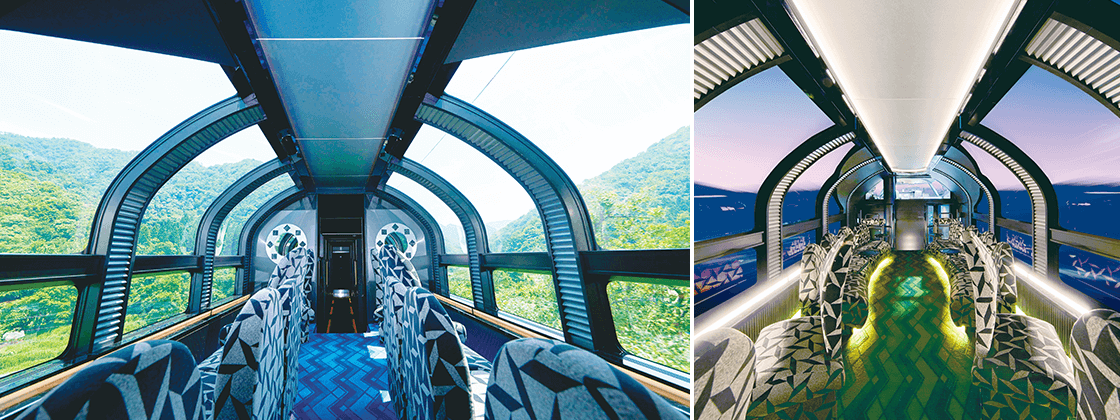 空まで望むことができる開放的な展望室から雄大な景色や星空といった車窓をお楽しみいただけるとともに、展望デッキでは沿線の風を感じていただけます。