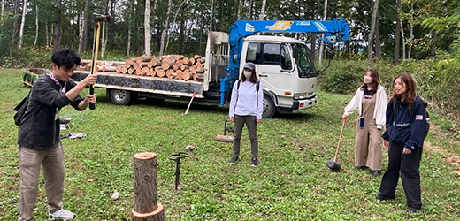 当日の主な活動としては、北海道恵庭市にある「えこりん村」において、午前中はウエルカムセンター横にある森に入り、森の枯れ木や白樺を切断した樹木をトラックに集める森の清掃活動を実施しました。