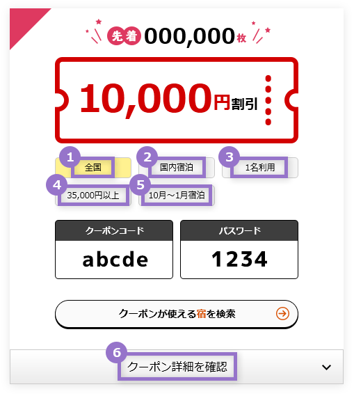 先着〇〇枚:クーポン券配布枚数 〇〇円以上:最低利用金額 〇〇名以上:最低利用人数
