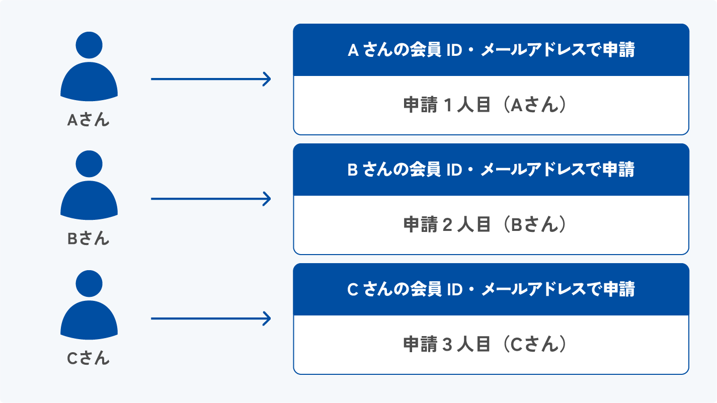 申請受付後に予約の変更や取消などで受付番号が変わった場合、必ず再申請をお願いします。再申請いただいた場合は、最新の申請(最も新しい申請)にて承ります。