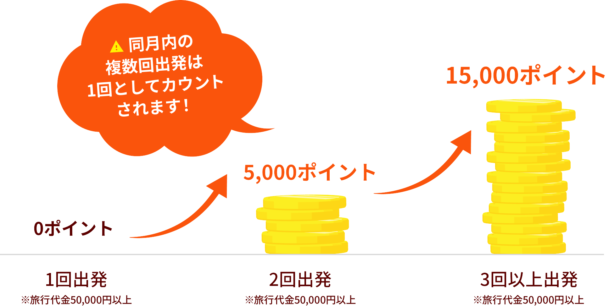 対象期間内にエントリーをし、旅行代金が1予約あたり50,000円以上の旅行に2回出発で5,000ポイント、3回以上出発で15,000ポイントを還元いたします。ただし、同月内の複数回出発は1回としてカウントします。