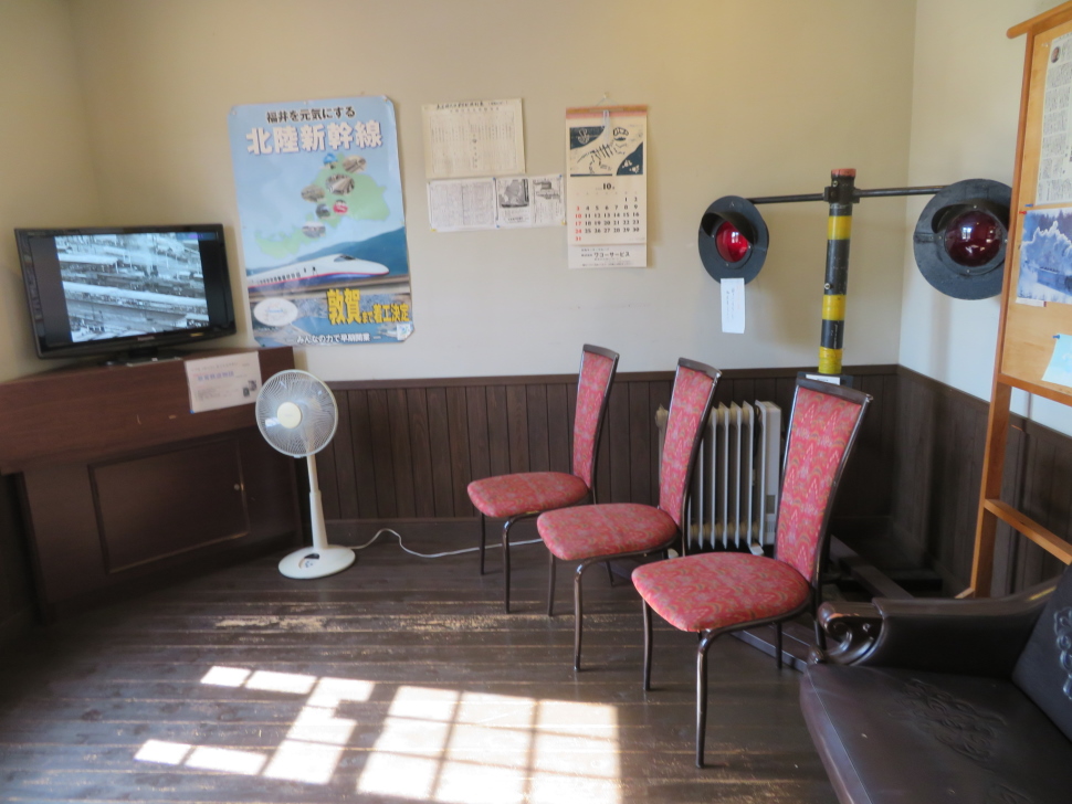 旧敦賀港駅舎には、敦賀の鉄道の歴史を紹介するパネルや貴重な鉄道資料を展示しているが、驚いたのは往時の待合室が再現されていた。レトロな椅子が懐かしい。