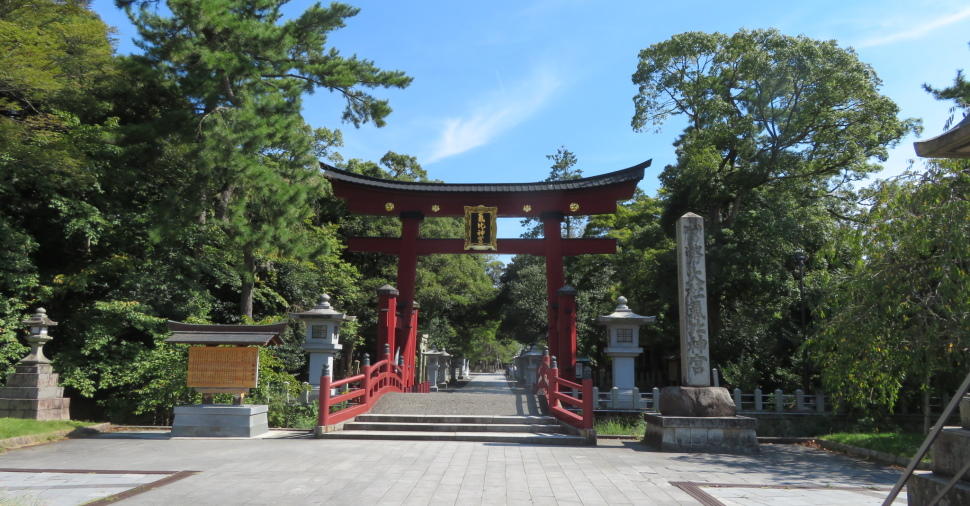 敦賀市民に「けいさん」の愛称で親しまれている気比神宮は、大宝2年(702)に造営された由緒ある北陸道の総鎮守だ。参道に立って観光客を迎える真っ赤な大鳥居は高さ約11mもあり、春日大社や嚴島神社と並ぶ日本三大木造大鳥居のひとつに数えられている。