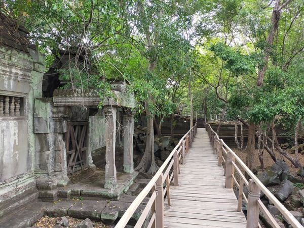 密林にのみ込まれた幻の遺跡ベン・メリア。森の中にひっそりと眠る巨大寺院遺跡で、ほとんどは未修復のまま保存されています。ベン・メリアとは蓮池の意味で、環濠には蓮の花が咲いています。