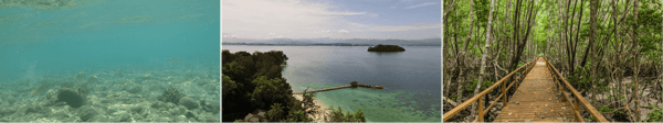 島内は深い熱帯雨林に包まれ、静かな入江が点在する神秘的な景観。