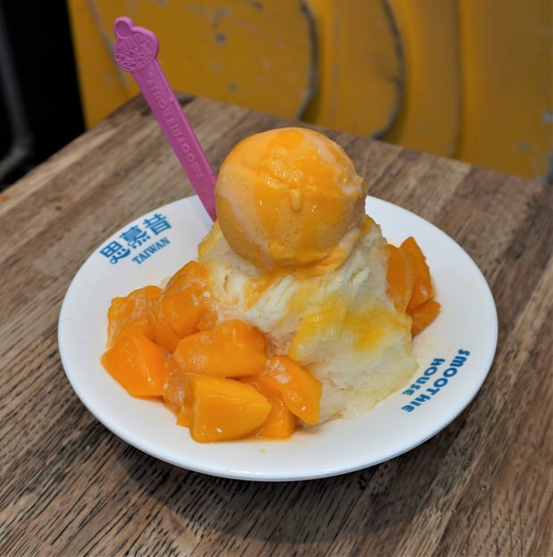 おやつタイムは台湾スイーツの代表格・マンゴーかき氷! ふわふわのかき氷「雪花冰(シェーファーピン)」が人気の「思慕昔(スームウシー)」はグルメの名店や雑貨店が集まる永康街にあるので、ショッピングの合間の休憩にもおすすめです。