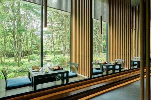 朝日が差し込む神秘的なウォーターガーデンの眺めとともにお楽しみください。