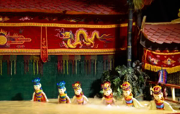 水面を舞台にしたベトナムの伝統人形劇は、背後の水中で人形を操り、舞台脇では楽団が音楽や効果音を奏でます。