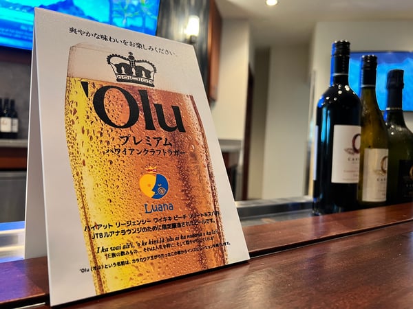 夕方の時間帯は、ビールやワイン含むアルコールも楽しめます。現地でのお酒の費用を賢く節約!「ルックJTBプレミアムルアナラウンジ&テラス」のためだけに作られた地ビール”Olu”を是非ご賞味ください。