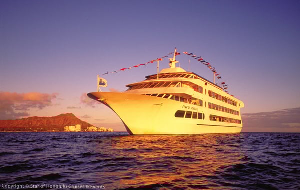 ディナーの他にフラやジャズなどの楽しいイベントも盛りだくさん。船上からはワイキキの美しい夜景もお楽しみいただけます。
