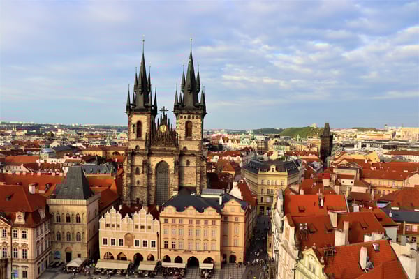 旧市街散策の起点となる旧市街広場とティーン教会。旧市庁舎の塔から一望できます