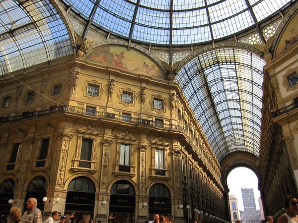 ガレリア・ヴィットーリオ・エマヌエーレ2世。床にある牛のモザイク画の窪みにかかとをつけて一回転すると幸運が訪れると言われています。