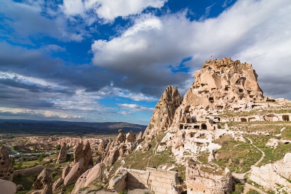 「尖った要塞」という意味をもつ「ウチヒサール」へ。ここはカッパドキア一帯で最も高い場所にある村です。もともと敵の侵入を防ぐために城塞として利用された岩山があり、その頂上からはカッパドキアの奇岩群を一望できます。