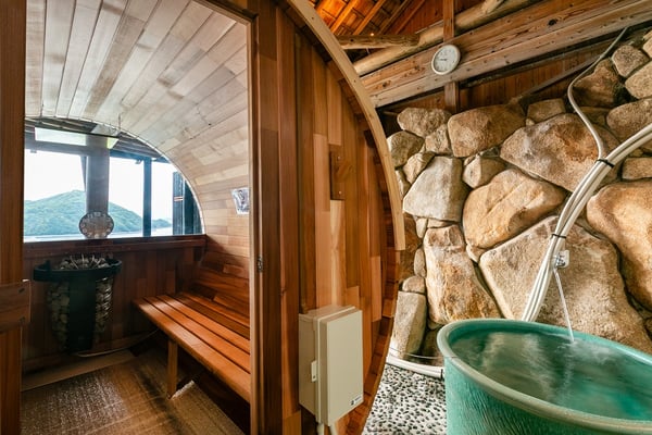 大切な人との2人旅でおすすめなのが、「きのえ温泉ホテル清風館」のなかで一番眺望がよい最上階の角部屋にある特別室・Deluxe Twin「陽光」。客室にはヒノキの露天風呂(温泉ではない)だけではなく、北欧の本格的なプライベートサウナがあり、ベッドは快適な眠りをサポートするシモンズ社製のセミダブルを配置。露天風呂や窓辺のソファーからは、朝日が昇る美しい光景を独占できます。記念日や特別な日に贅沢な時間を過ごしてみませんか。