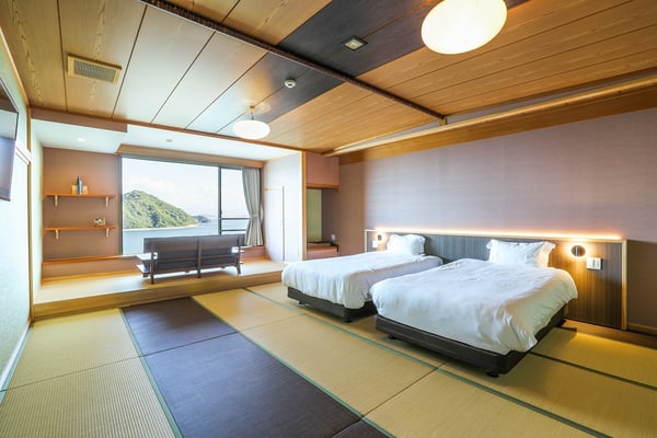 3人以上で泊まれる客室は、和室12畳と洋室ツインの「和洋室・特別室(最大8名)」や和室12畳の「和室(最大6名)」。瀬戸内海の美しい多島美が一望できる四国側の客室「トリプルルーム(最大3名)」のほか、ジャパニーズモダンの世界観を表現する作家・三枡正典氏がデザインした「清風 Mimasu Japanese Modern(最大6名)」もあります。