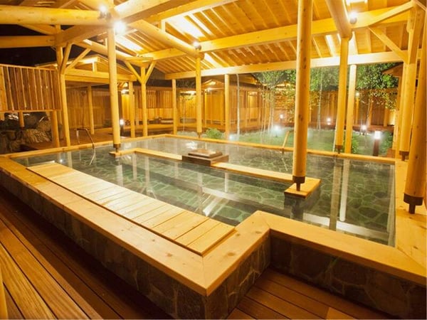 乳白濁の硫黄泉を堪能する東屋付露天風呂が人気です!大浴場にはお子さま用畳敷きの洗い場があり、安心してお風呂をお楽しみいただけます。