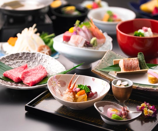 また、特別フロア「離座」に宿泊したゲストには専用食事処「千代見草」での懐石が用意されます。器には越前焼や漆器を用い、盛り付けはまるで芸術作品のよう。静かな個室空間で一皿ずつ丁寧に提供される懐石は、大切な記念日やご夫婦の時間を彩る特別な体験となるでしょう。