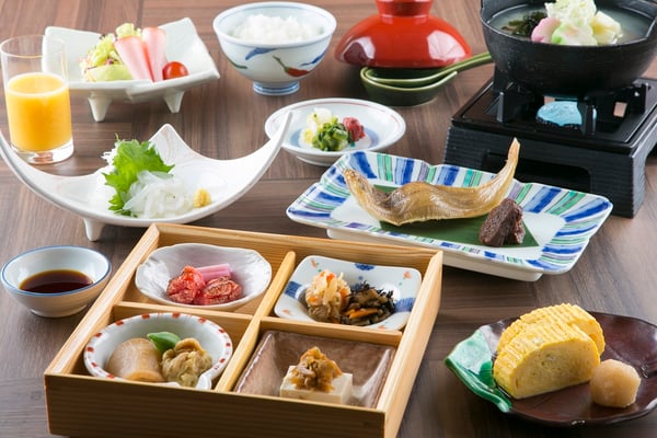 朝食は和定食が基本です。福井県産コシヒカリのご飯に、香ばしい焼き魚、湯気の立つ味噌汁、小鉢の数々。派手さはないものの、身体のことを考えた数種類のおかずは、1日のはじまりにふさわしい滋味あふれる献立です。いつもより少し贅沢な朝食を前に、静かに箸を進める時間は、ここでしか味わえない贅沢です。