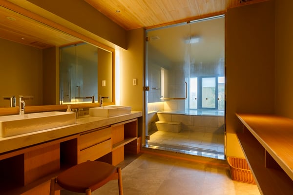 「双鶴」は、ベッドルームに加えて広々としたリビングルームを備え、源泉掛け流しの半露天風呂では、庭園や庭木の緑を眺めながら、プライベートな湯浴みをいつでも楽しめるのが最大の特徴。上質な家具や調度品が配置され、ワイン、地ビール、日本酒、コーヒーなどを客室内で自由に楽しむことができるので、パートナーと夕暮れ時に半露天風呂でくつろぎつつ、室内でアペリティフを味わう贅沢な時間が過ごせます。