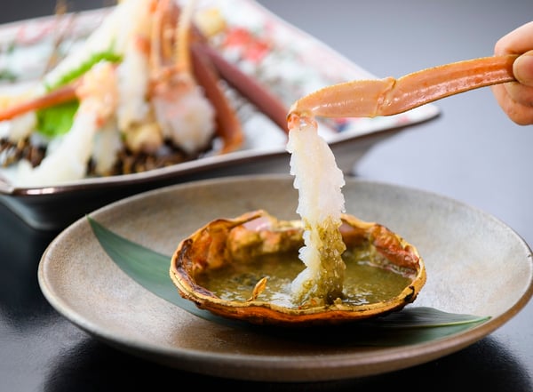 さらに、11月〜3月には厳選され高品質を保証する黄色いタグ付きの越前ガニをメイン料理にした越前地ガニ懐石膳が登場。調理前700〜900g級の越前ガニを1人あたり0.5〜1杯を目安に、かに刺し、甲羅焼き、天ぷらなど多彩な調理法で提供。たとえば、炭火で焼き上げられる甲羅焼きは、ぱちぱちと香ばしい音を立て、湯気の向こうに透き通る身が見え、口に含むと潮の香りと甘みが広がる逸品。