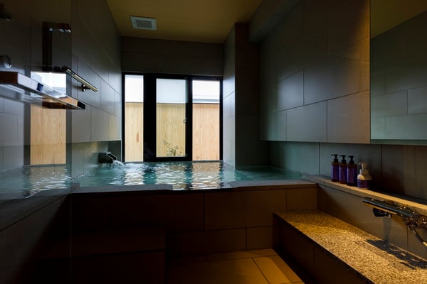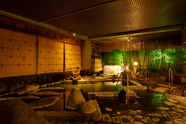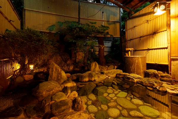 「芦の湯」では、間接照明に照らされた夜の露天風呂がおすすめ。岩風呂や円形の大きな浴槽がある露天風呂に浸かりながらゆったりと過ごしていると、心身がときほぐされていくのが実感できます。