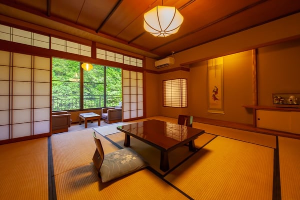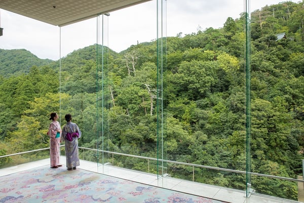 大きなガラス窓の向こうに鶴仙渓の四季の景色が広がる源泉半露天風呂付特別室