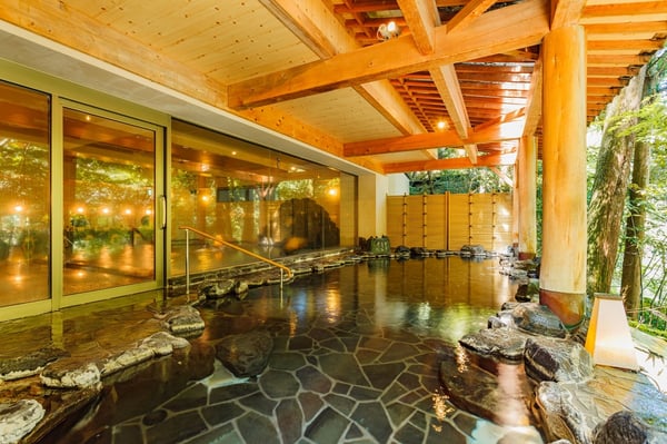 もうひとつの渓流露天風呂.「河鹿」は「鶴仙」の開放感とは異なり、静かで落ち着いた雰囲気の中でじっくり温泉に浸かれます。露天風呂は夜にライトアップされ昼間とは違う佇まいを魅せてくれるので、男女の入替時間を確認しておきましょう。内湯は壁一面がガラス張りになっているので、四季折々の景色が屋内にいながら楽しめるのがうれしいですね。
